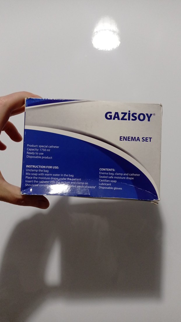 Gazisoy enema set, 1750 ml kapasiteli beyaz gri tüp ve özel kateter içerir. Tek kullanımlık olup kullanım talimatı ve temizleme ekipmanları mevcuttur.