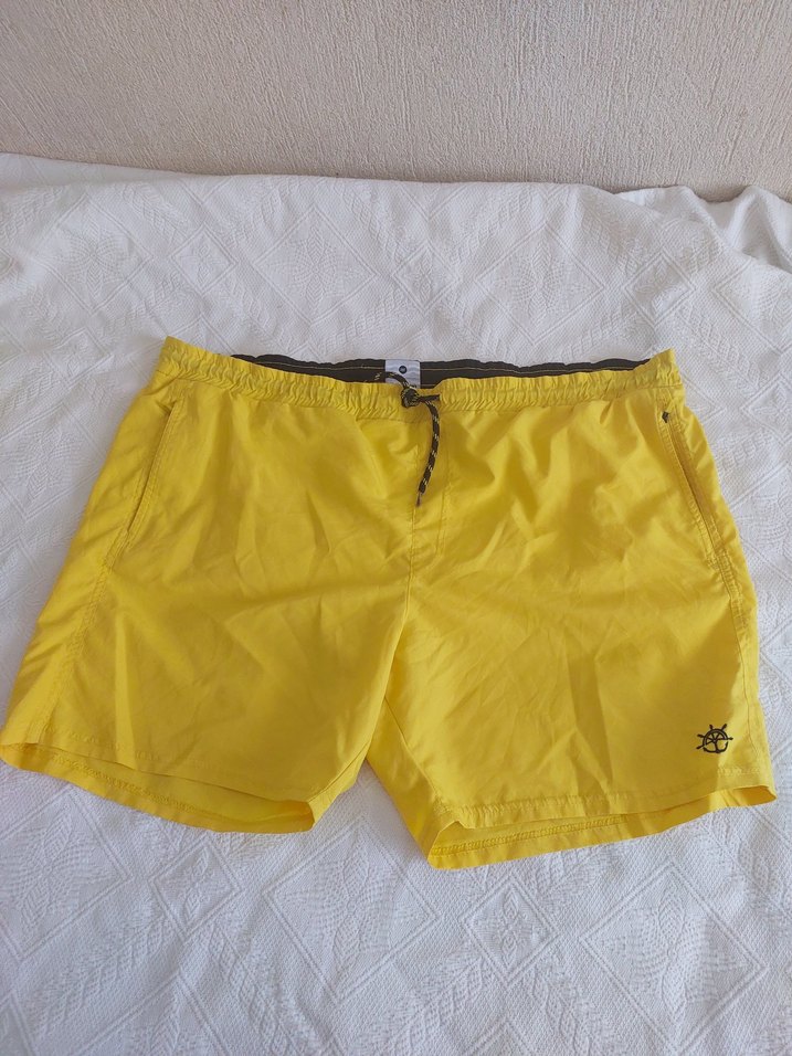 Parlak sarı renkte, bol kesim erkek mini şort. Düz ve desen içermeyen tasarımıyla plaj için uygun, rahat ve şık bir seçenek. 3xl beden