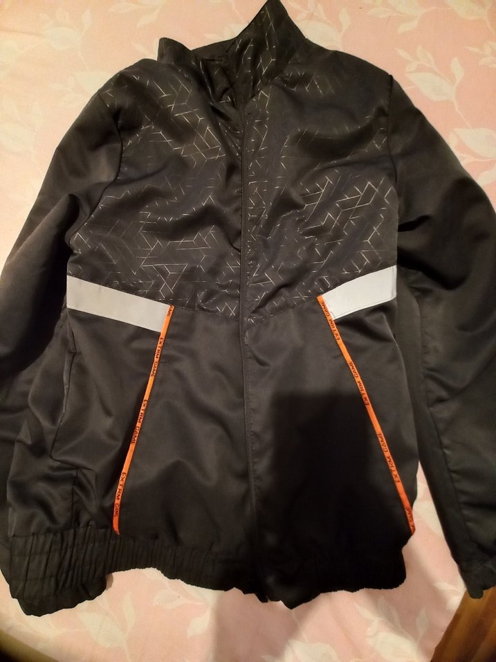 Yüksek yakalı, fermuarlı siyah erkek çocuk ceketi. Sentetik kumaştan, geometrik desenli ve reflektör detaylı, sokak stili için uygun. neredeyse hiç kullanılmadı.