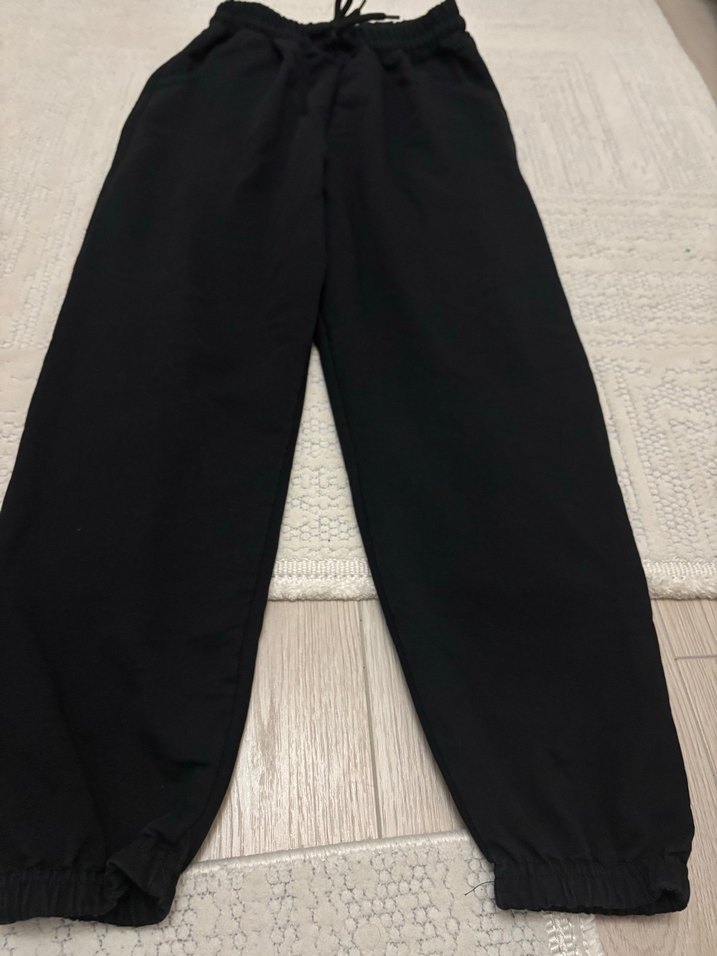 Siyah, bol kesim, midi boy kadın eşofman. Elastik bel ve paça uçlarına sahip, yumuşak kumaştan üretilmiştir. 11-12 yaş unisex eşofman