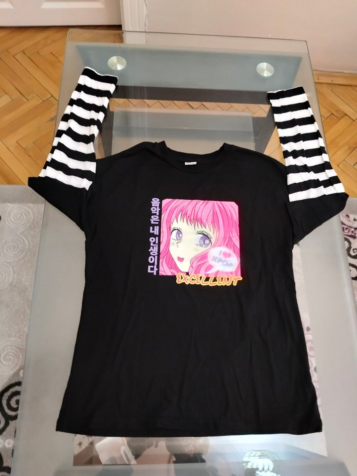 Siyah, bol kesim kız çocuk tişörtü, önünde anime tarzı baskı ve çizgili uzun kollu detaylarla sokak tarzı sunar. LC Waikiki 13-14 yaş .
