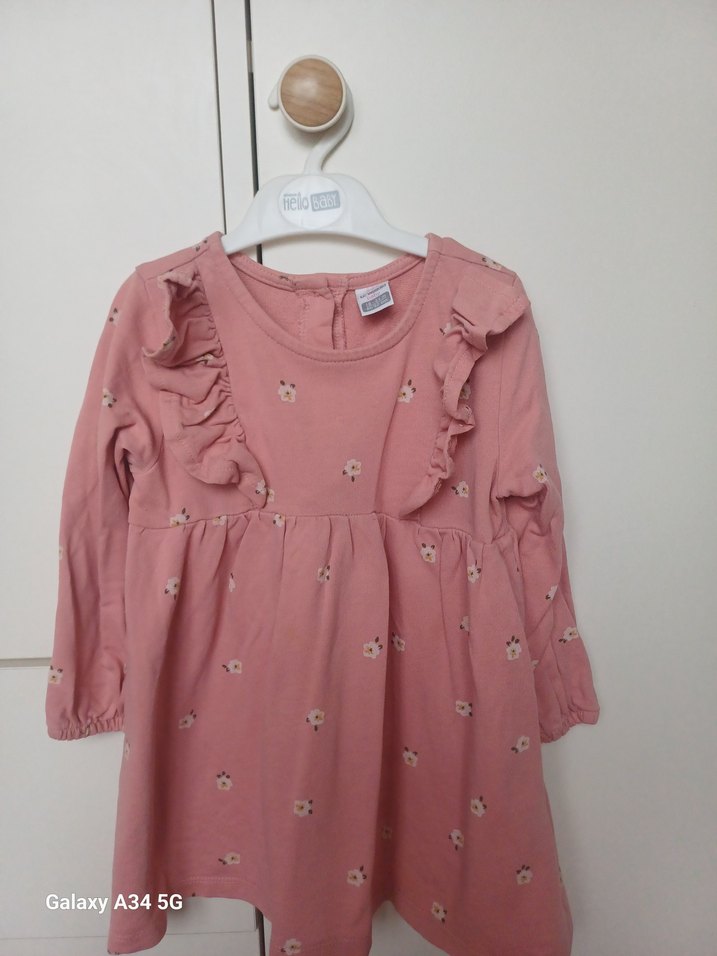 Uzun kollu, düğmeli arka kapamalı bol kesim kız elbisesi. Yumuşak sentetik kumaştan, pastel pembe çiçek baskılı ve bisiklet yaka.