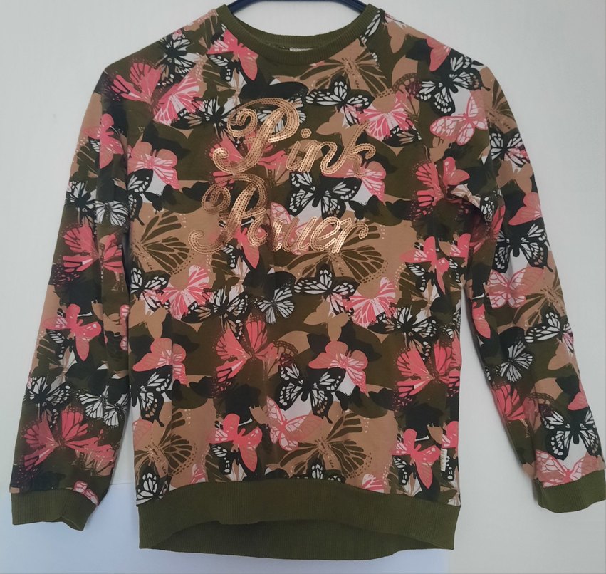 lc waikiki'nin eski bir ürünüdür Kız çocuk sweatshirt, uzun kollu ve bisiklet yaka. Renkli kelebek baskılı, "Pink Power" yazılı, asker deseni üzerinde kelebekler vardır