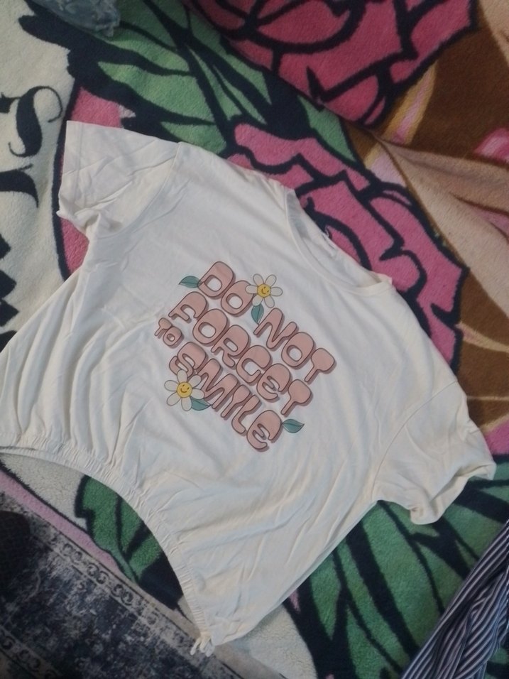 Bej renkli, kısa kollu, bol kesim kız çocuk tişörtü. Pastel renklerde 'Do Not Forget to Smile' yazılı baskı ve çiçek detaylarıyla rahat ve şık görünüme sahip Crop,11-12 yaşa uygun.Ürün sadece bir kaç kez giyildi.
