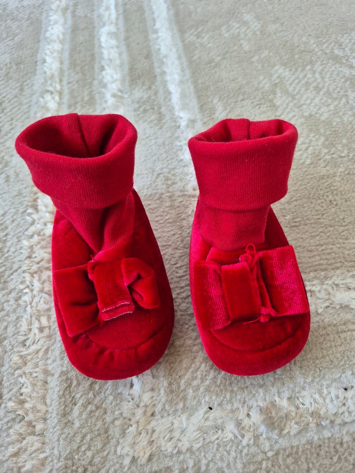 Kız çocukları için yumuşak ve sıcak kumaştan yapılmış kırmızı ev terlikleri. Klasik tarzda, üzerinde dekoratif fiyonk bulunur. İç mekanda ayakları sıcak tutar.