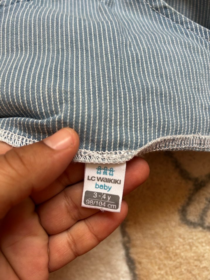 LC Waikiki marka, mavi ve gri çizgili desenli bebek slingidir. 3-4 yaş, 98-104 cm çocuklar için uygundur. Rahat ve güvenli taşıma sağlar.