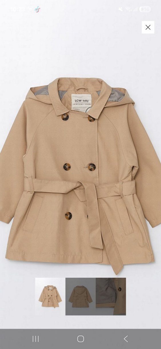Bej renkli, kapüşonlu kız çocuk trençkotu, düğmeli ve kuşaklıdır. 24-36 ay Kızım büyüdüğü için satılık Çok iyi durumda