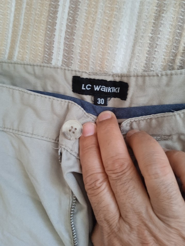 LC Waikiki markalı, keten kumaştan yapılmış, bol kesim ve düğmeli bej erkek mini pantolon. Günlük ve sokak stiline uygundur. Beden 30.