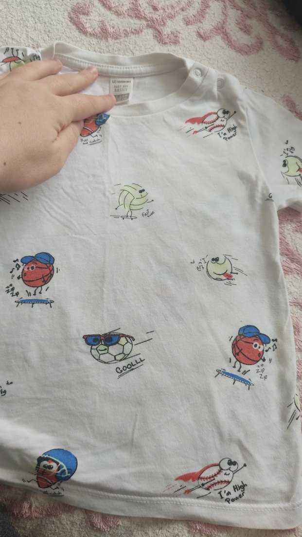 Beyaz çocuk atlet, pastel renklerde spor topu desenleriyle süslenmiştir. Omuzda kolay giydirme için çıtçıt düğmeler bulunur. ⚽ lekeler var