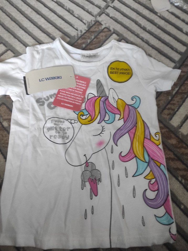 Pamuklu beyaz tişört, renkli baskılı tek boynuzlu at deseni, kısa kollu ve bol kesim, rahat sokak stili için uygun.