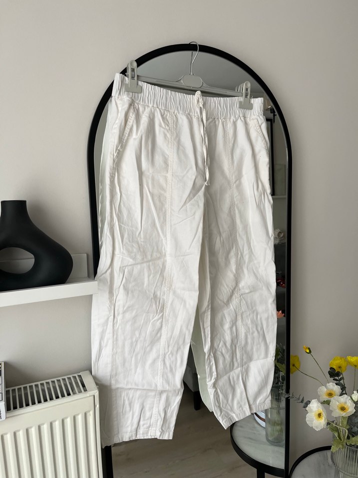 Beyaz, keten kumaştan bol kesim midi uzunlukta pantolon. Minimalist, desen içermeyen rahat ve şık bir tasarıma sahiptir. Giyilmedi