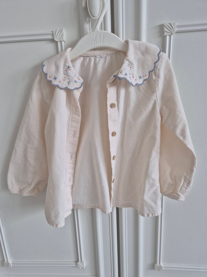 Vintage tarzda, bol kesim, uzun kollu, yakası nakışlı beyaz kız çocuk gömleği. Önü düğmeli, yumuşak ve rahat kumaştan yapılmıştır.