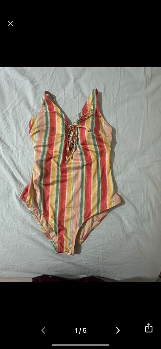 Bohem tarzda, bağcıklı ön detaylı, çok renkli pastel çizgili, askılı ve vücuda oturan kadın mayo. S bedene uygundur . Bir sorunu yoktur.