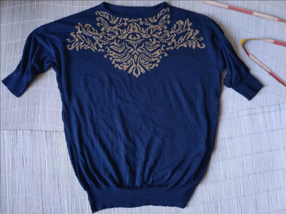 Bohem tarzda, baskılı desenli, mavi renkte, kısa kollu, yuvarlak yakalı, bol kesim hamile tişörtü. Drapeli ve midi uzunlukta, parti için uygun.