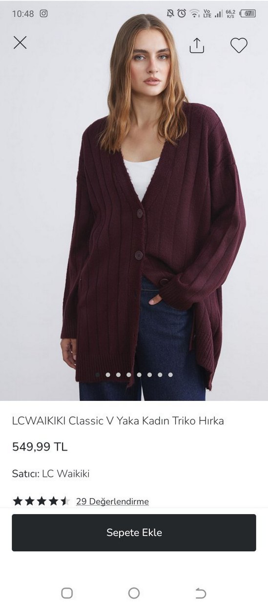Bordo renkli, yumuşak yün kumaştan örülmüş, uzun kollu ve V yaka, bol kesim kadın triko hırka. Rahat ve günlük kullanıma uygun. sayılı kullandım yeni ve sorunsuz