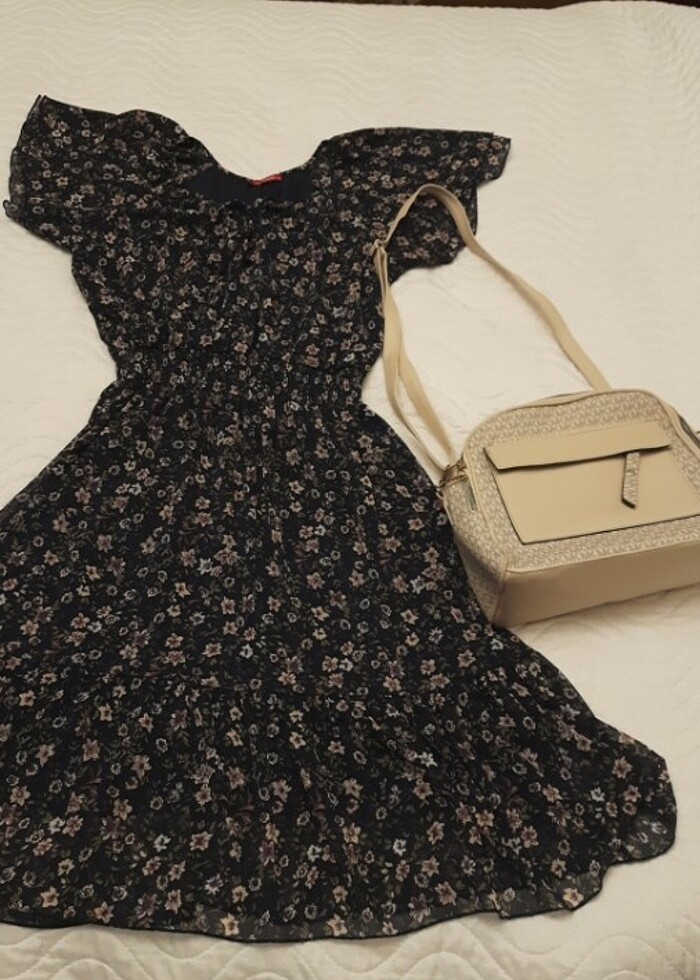 Lc waikiki marka, şifon çiçek desenli lacivert renkli elbise. Astarlıdır, iç göstermez. 38 40 beden. Çanta hediyedir.