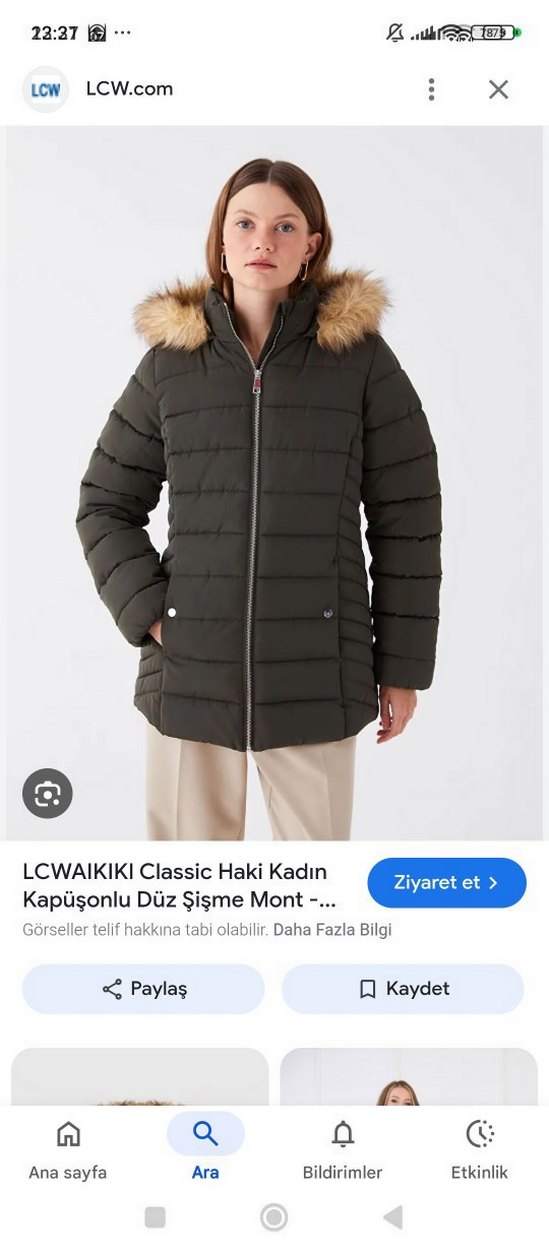LC Waikiki klasik haki renkli, kapüşonlu ve kürk detaylı kadın mont. Sentetik kumaştan, düz şişme yapıda ve günlük kullanıma uygun uzun kollu bir model.