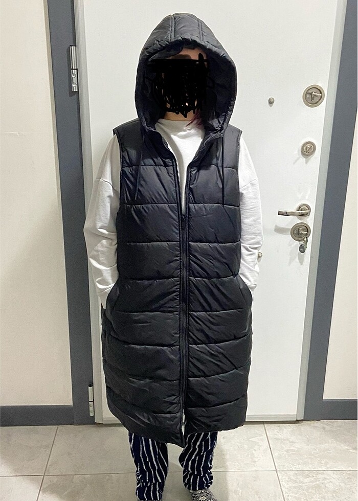Yelek sadece 1 kez giyildi. Hicbir kusuru yoktur. 46 beden, siyah sisme yelek. Modelin boyu 160 civarlarinda.