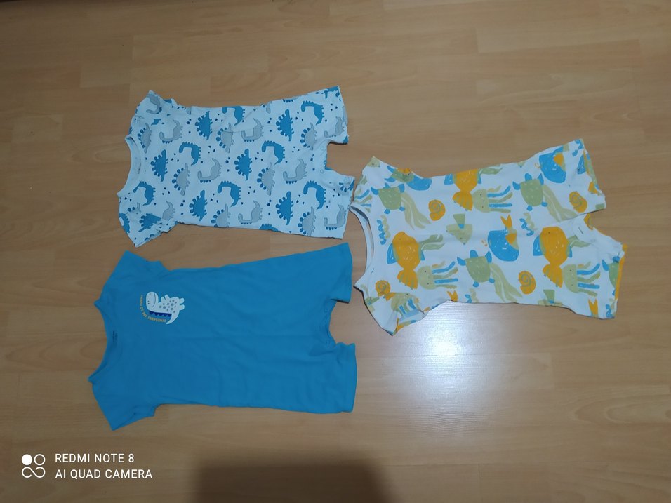 Renkli dinozor baskılı ve düz mavi olmak üzere üçlü çocuk atlet seti. Yumuşak ve rahat kumaştan üretilmiştir. Az kullanılmış sağlam tertemiz fotoğrafta görüldüğü gibi balık desenli olanın ayak kısmında küçük bir yırtık var onun dışında sağlamlar