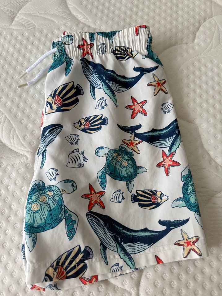 Elastik bel ve bağcıklı, deniz canlıları ve denizyıldızı desenli renkli erkek çocuk deniz şortu.