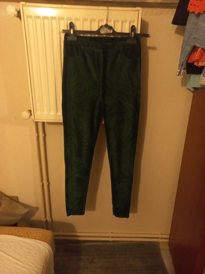 Koyu yeşil renkte, normal boyda, dar kesim çocuk tayt. Günlük rahat sokak stili için uygundur. bel lastikli 33cm boy 93cm