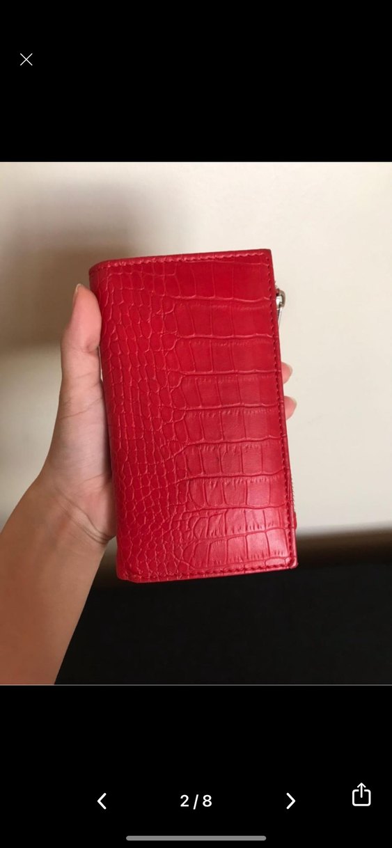 Kırmızı deri kadın cüzdanı, renkli yılan deseni ve fermuarlı kapanışa sahiptir, günlük kullanım için uygundur.