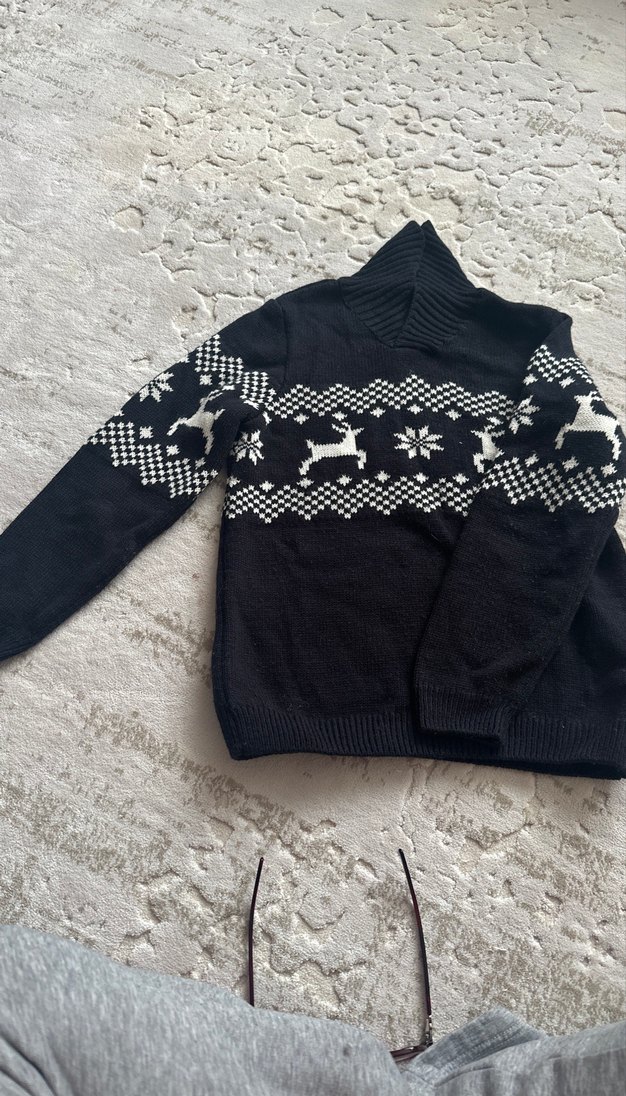 Yumuşak dokuli, kış temalı, koyu lacivert kazak. Yakası dik olarak ya da kıvrılıp yakalı gibi de kullanılabilir.