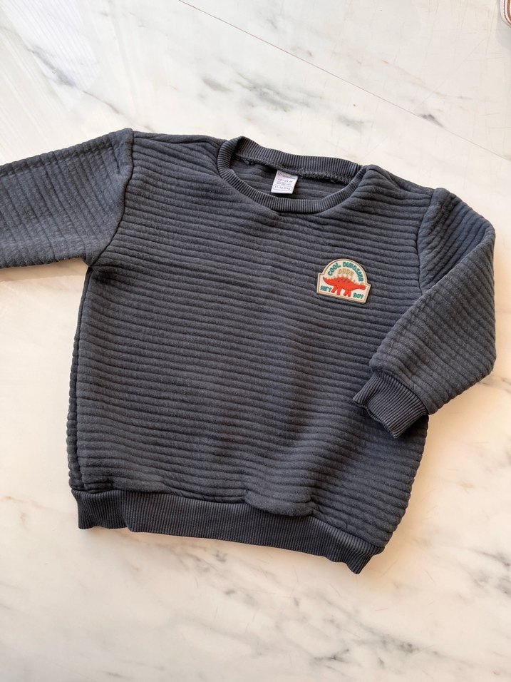 Uzun kollu, bisiklet yaka, yumuşak örme kumaştan yapılmış koyu gri renkli erkek çocuk sweatshirtü. Salaş kesim ve küçük bir rozet detayıyla sade tasarım sunar.