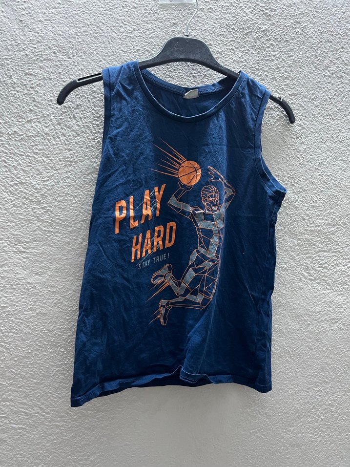 Koyu mavi, kolsuz, yüksek yakalı ve bol kesim erkek çocuk tişörtü. Baskılı basketbol oyuncusu ve "PLAY HARD" yazısı içerir. Sokak stili ve rock punk havasında. Lc waikiki marka sorunsuz sıfır kollu tişört