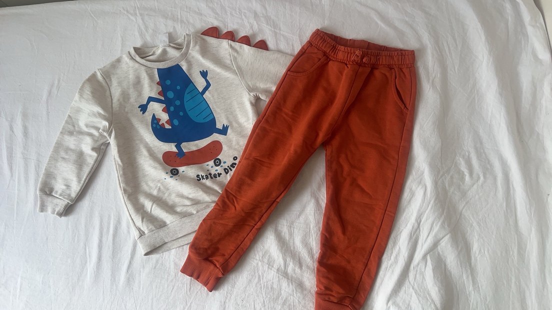 4-5 yaş için uygundur. Ürün fazla giyilmedi.Dinozor baskılı. Çocuk eşofman takımı, cepli rahat ve günlük sokak stili sunar.