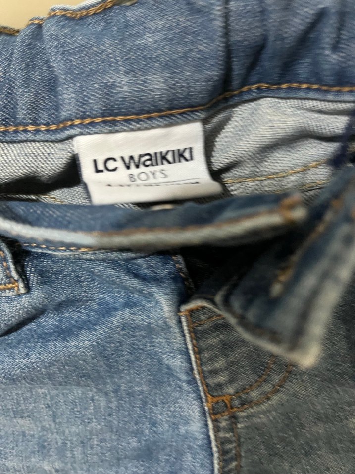 LC Waikiki markalı, kemerli ve bol kesim kot pantolon. Koyu mavi renkte, baskılı desene sahip, günlük rahat kullanım için uygundur.