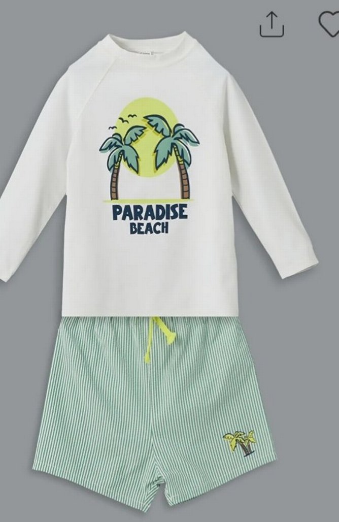 Beyaz uzun kollu üstü pastel palmiye baskılı ve "Paradise Beach" yazılı, çizgili yüzme şortu ile takım halinde erkek mayo takımı.