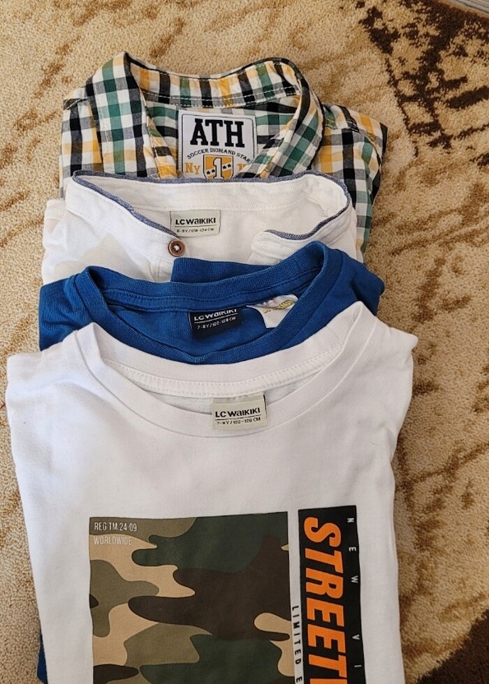 hepside temiz ve sağlamdır. 4 parçadır.2 tshirt uzun kollu 1 tanesi kisa kollu.gömlek uzun kollu ve ekoselidir.6 ve 8 yaş arası.