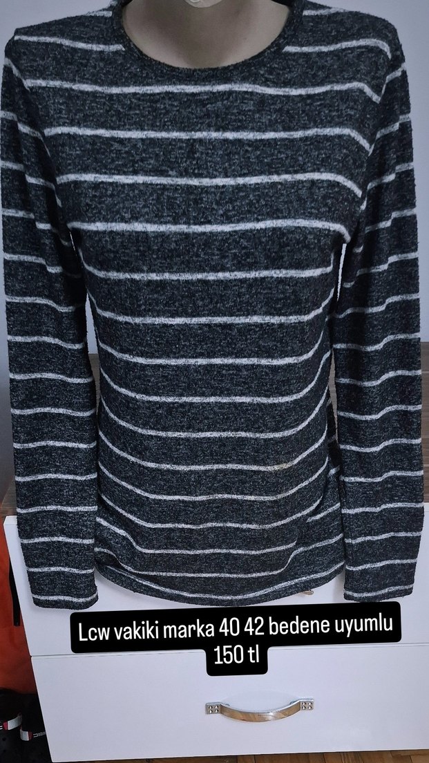 LC Waikiki markasına ait, çizgili, uzun kollu, tekne yaka, yün triko kazak. Rahat kalıp ve trend sokak stiline uygundur. 40-42 beden uyumludur.