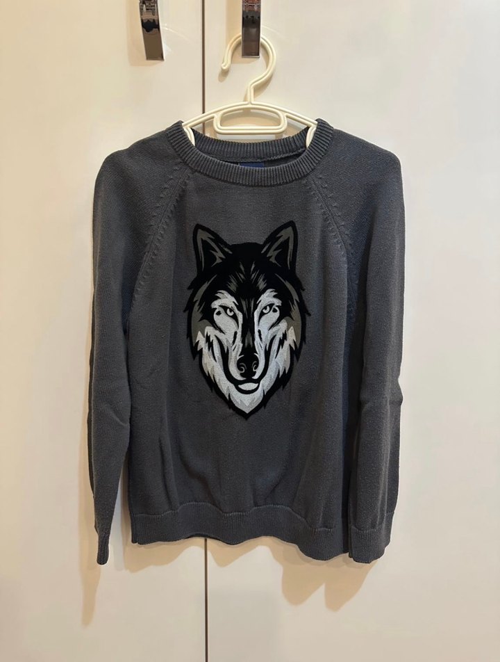 Gri renkli, uzun kollu ve bisiklet yaka erkek çocuk sweatshirtü. Bol kesim, yumuşak kumaş ve kürk detaylı baskılı kurt deseniyle sokak stili için uygundur. Herhangi bir defosu yok
