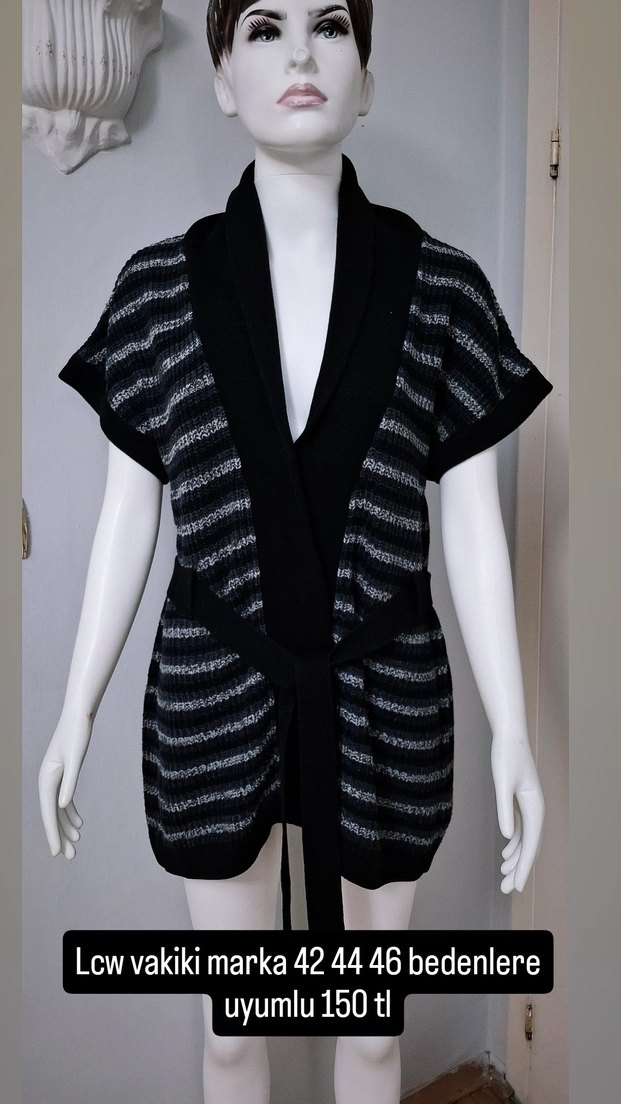 LC Waikiki markasına ait kolsuz, gevşek kesim ve kısa boy örgü hamile hırkası. V yaka ve gri çizgili desene sahiptir, günlük kullanıma uygundur.