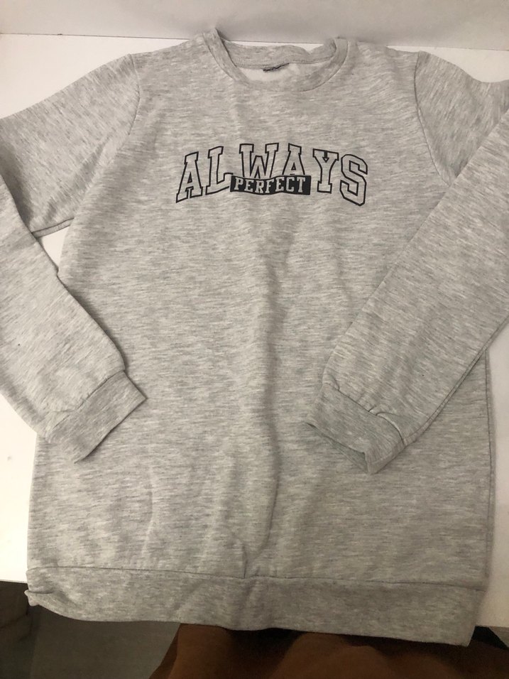 Sorunsuz. Gri renkte, uzun kollu, bisiklet yaka ve bol kesim sweatshirt. "ALWAYS PERFECT" baskılı, yumuşak ve sıcak kumaştan üretilmiştir. Günlük kullanım için uygundur.