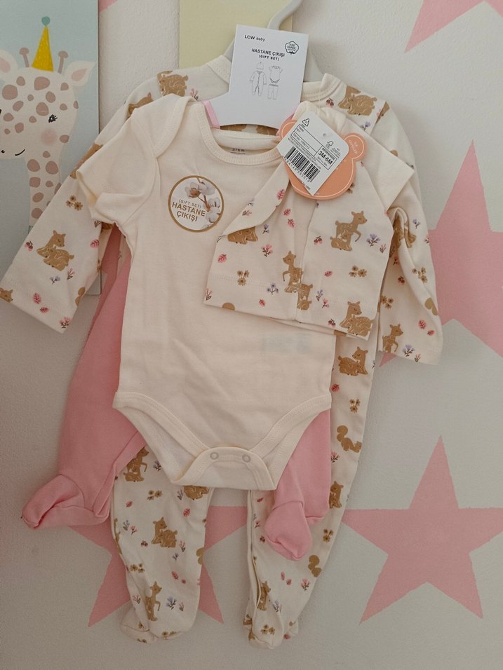 Pastel pembe renkte, düğmeli uzun kollu body ve sevimli geyik desenli patikli tulumdan oluşan bebek kıyafet seti.