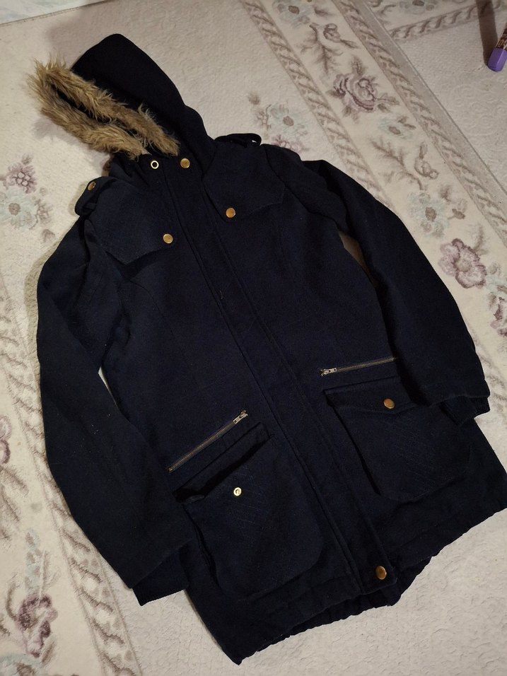 Kadın lacivert midi kaban, suni kürk detaylı kapüşon ve uzun kollu, rahat kesim yumuşak kumaştan üretilmiştir. Günlük kullanıma uygundur. Tüm detaylarını ekledim 36-38 bedene olur