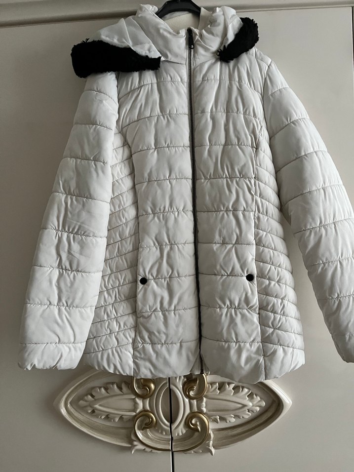 Beyaz, kürk detaylı, kısa kesim ve dar kalıp kışlık mont. Notlu yaka ve kayışlı kollara sahip, günlük rahatlık için sentetik kumaştan üretilmiştir. ❄️