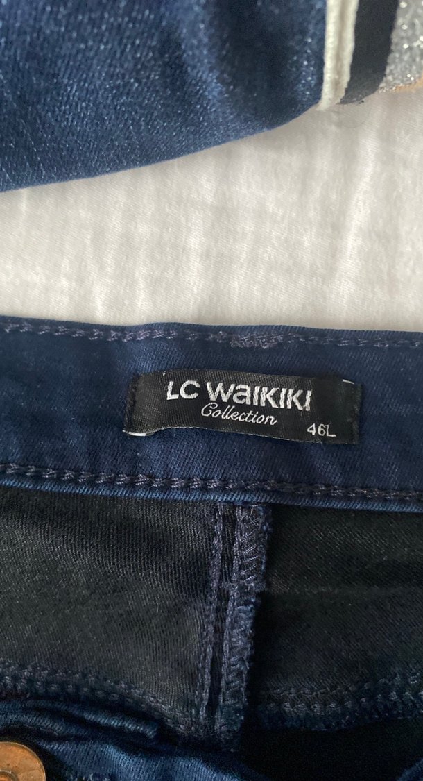 LC Waikiki'den koyu mavi renkli, gevşek kesim ve tokalı detaylı kot pantolon. Günlük kullanım için baskılı, rahat bir sokak stili sunar. Beden 46L.