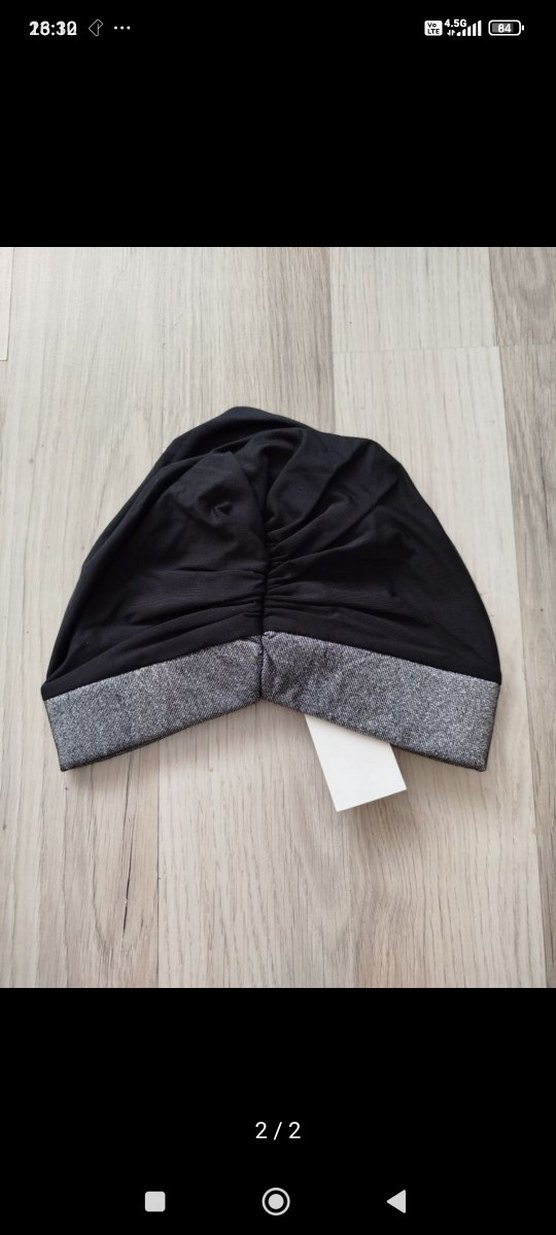 Gri elastik bantlı, siyah üst kısmı olan kadın havuz bonesi etiketli