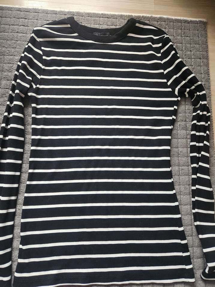 Pamuk kumaştan, uzun kollu ve bisiklet yaka, çizgili desenli ve normal midi boyda, dar kesim hamile tişörtü. Günlük rahat sokak stiline uygundur.