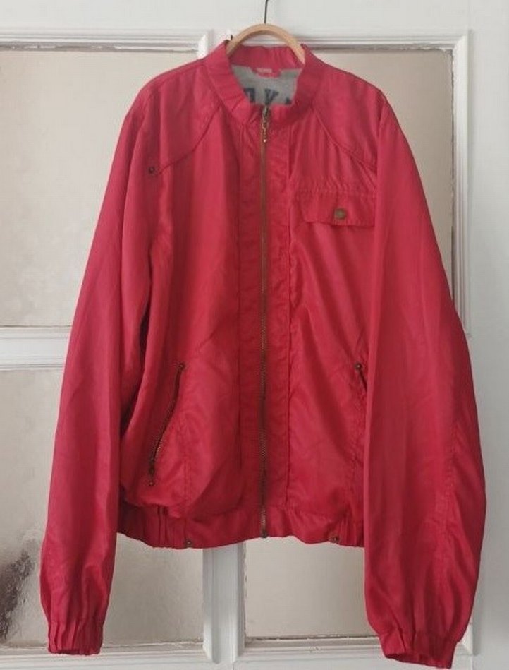 Parlak kırmızı sentetik kumaştan, fermuarlı ön ve uzun kollu kadın ceket. Salaş kesim, normal midi boy ve yakası kesik detaylıdır. Günlük kullanıma uygun athleisure tarzında.