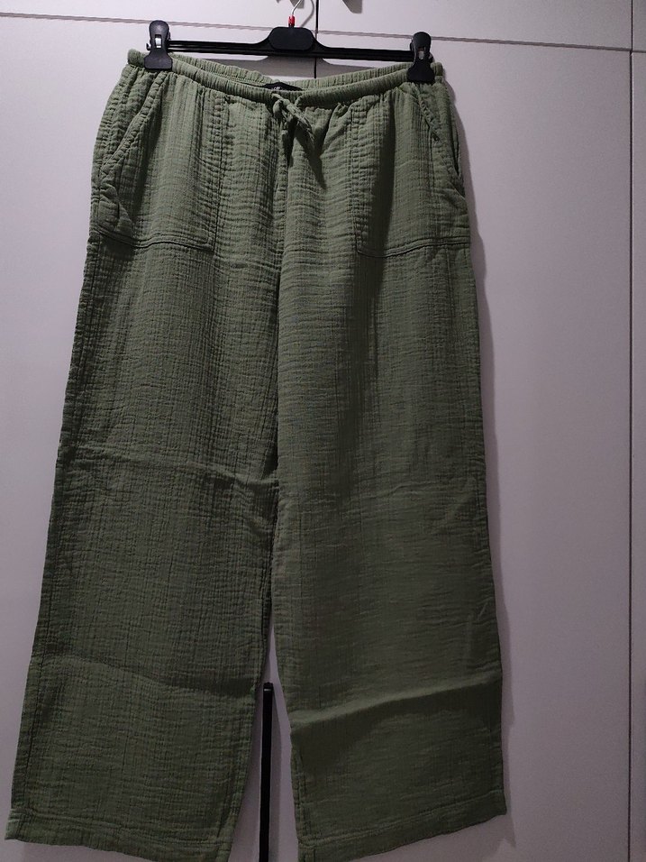 Yeşil renkte, pamuklu kumaştan, bol kesim ve uzun boy kadın pantolonu. Pileli detaylı ve bağcıklı bel ile rahat bir sokak stili sunar. 3 kez giyildi yeni gibi boyu kesildi boyum 162. 45-48 giyenlere olur