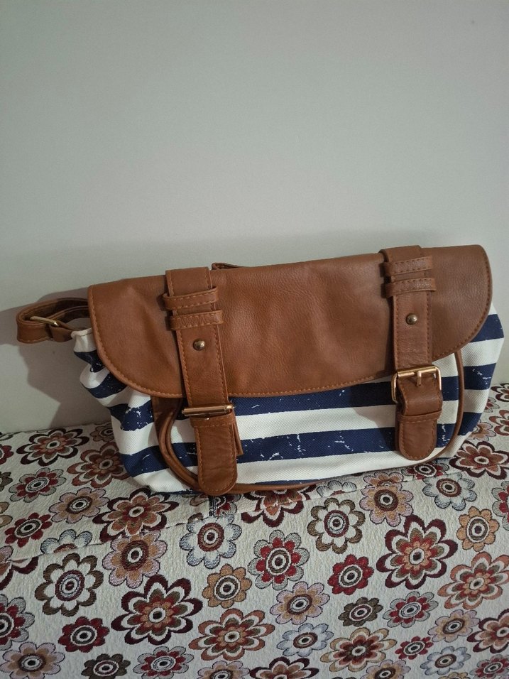 Bohem tarzı kahverengi deri tokalı çanta, mavi beyaz çizgili baskılı kumaş tabanlıdır. Günlük kullanım için uygundur.