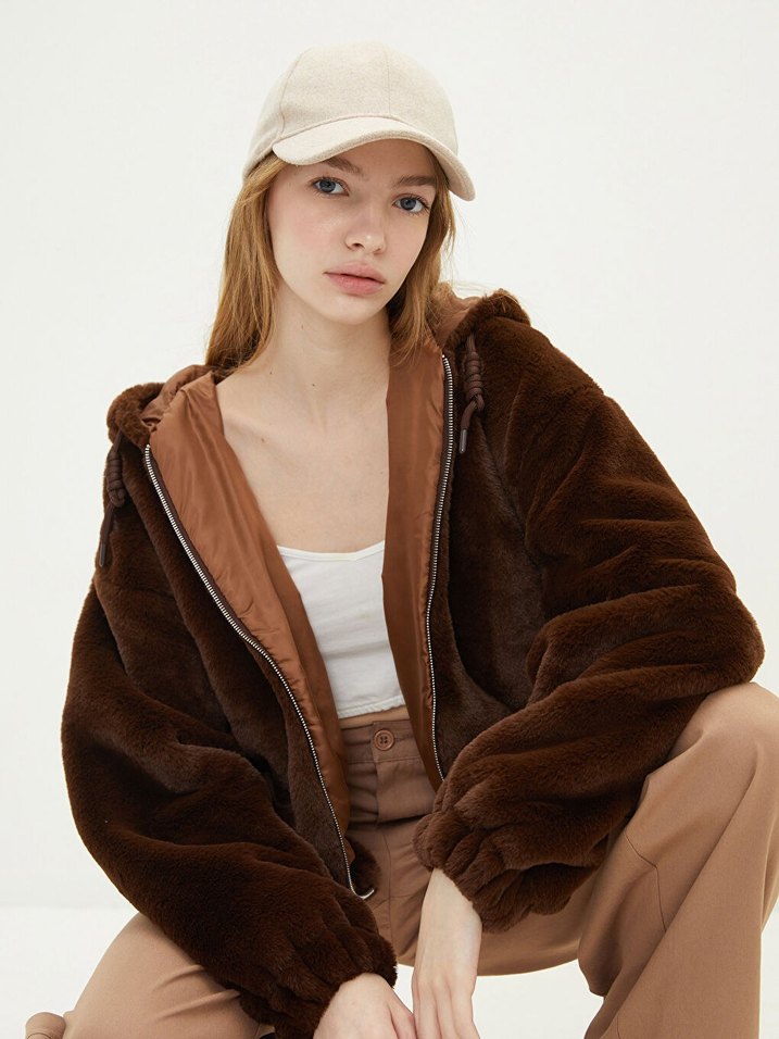 LC Waikiki Kahverengi Kapüşonlu Kadın Peluş Ceket