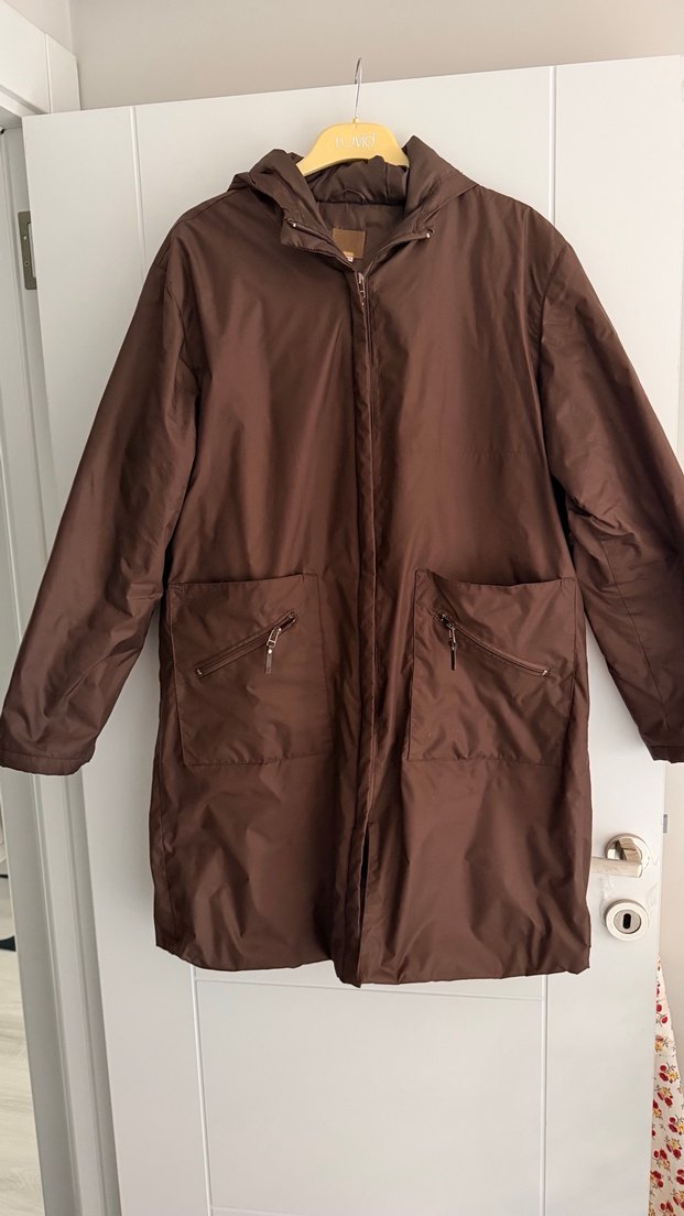 Kahverengi kadın ceketi, fermuarlı ön ve uzun kollu tasarımıyla rahat bir kesime sahiptir. Sentetik kumaştan üretilmiş, minimal ve sade stiliyle günlük kullanıma uygundur.