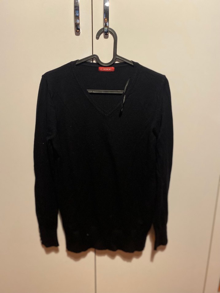 Siyah, uzun kollu, V yaka ve ince kesim kadın triko. Yumuşak ve sıcak kumaştan, sade ve günlük kullanıma uygun.