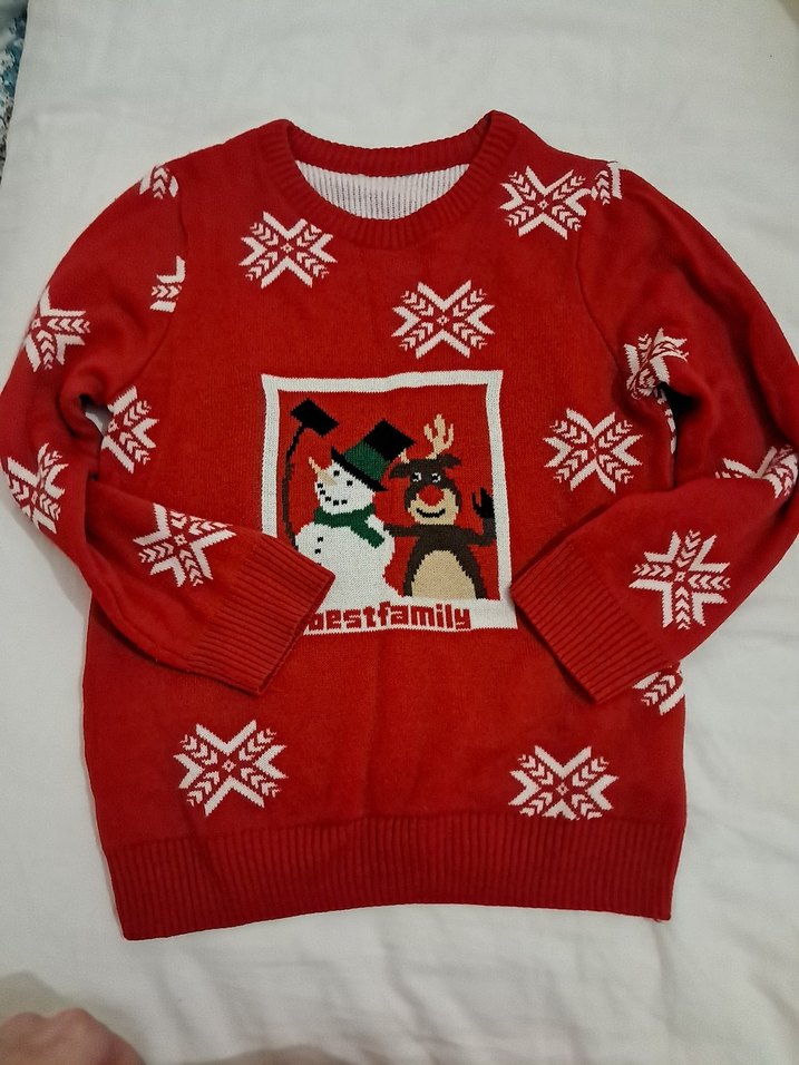LC Waikiki Kız erkek giyebilir çocuk için yuvarlak yaka, uzun kollu, örgü örme kumaştan yapılmış, kırmızı ve renkli baskılı kar tanesi ve kar adam-ren geyiği desenli, estfamily yazılı kazak.